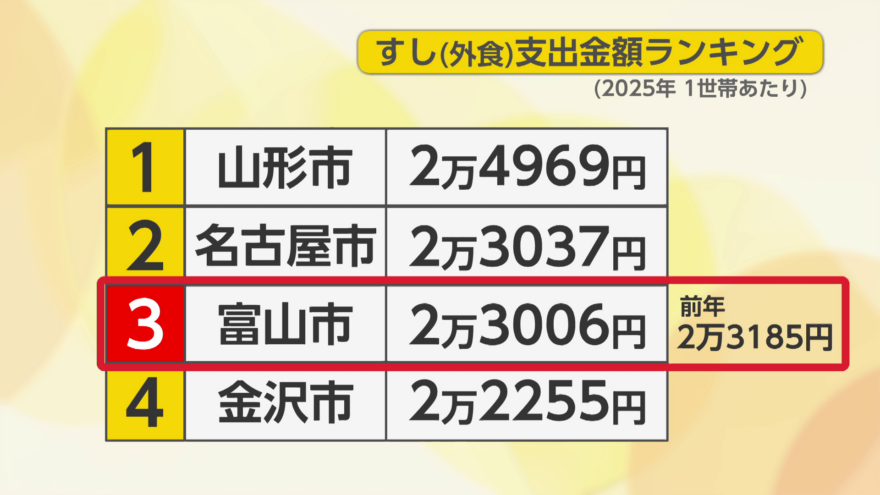 総務省の2025年家計調査によりますと、富山市の1世帯当たりの外食で、すしにかけた金額が2万3006円で前の年よりわずかに減少しました。