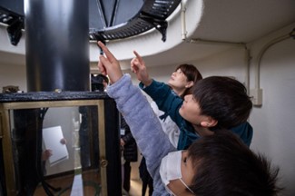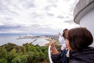 灯台に到着すると伏木海上保安部星野次長が伏木港の灯器の変遷と灯台の歴史について解説していただきました。普段見ることができない岩崎ノ鼻灯台の貴重な資料に参加者は興味津々。南砺市から来た中学生の参加者は「最初は小さな明かりだったことを知った。他のことも知りたくなった」と学びの時間となりました。そして、43段の階段をのぼり…灯台の最上部へ。岩崎ノ鼻灯台は毎年1回、桜の咲く春の時期だけ一般開放されることもあって参加者は灯台から見える晩秋の風景を楽しんでいました。