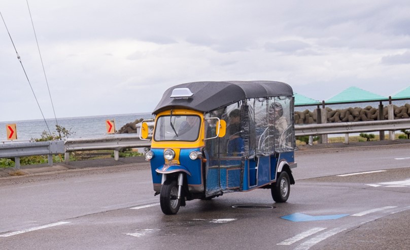 座学を終えると晴れ間が差し、天気は回復傾向に。高岡市のイベント会社SK企画が有料レンタルをしている三輪タクシー「トゥクトゥク」に乗車し、岩崎ノ鼻灯台まで向かいました。
