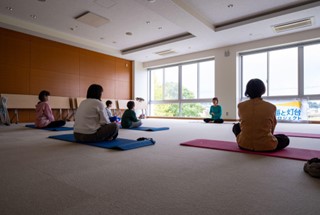 その後参加者は伏木コミュニティセンターで奥に見える灯台を見ながら、ヨガを実施。身体をほぐすストレッチや窓に映る緑を眺めながら瞑想を行い、リラックスする時間を過ごしました。