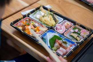 また、本イベントのために特別に作られた岩崎ノ鼻灯台特製弁当を配布。岩崎ノ鼻灯台は「桜の灯台」として知られているため、桜のピンクをイメージした具材や富山の海の幸が詰まった内容でした。