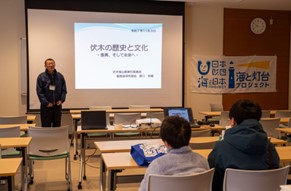 11月3日(月・祝)の朝はあいにくの天気だったため、ガイドを受けながら岩崎ノ鼻灯台までのウォーキングを伏木コミュニティセンターでの座学に振り替えました。講師の野口安嗣さんは地元の伏木高校で日本史を教えていた経験があり、伏木の歴史と文化をテーマに分かりやすく解説いただきました。